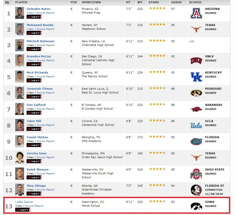 高中毕业时被ESPN综合评分83分四星高中生,在全美百大高中生排名第83,而在同届中锋中排名第13,现在我们以上帝视角看,这届中锋成才率非常高的,当年前三甲是艾顿、班巴、米切尔-罗宾逊,同时第5的理查兹和第7的加福德目前也在NBA打出声望,通过这个大家也能深刻体会到,美国篮球人才真的如雨后春笋般涌现,一茬一茬源源不断.