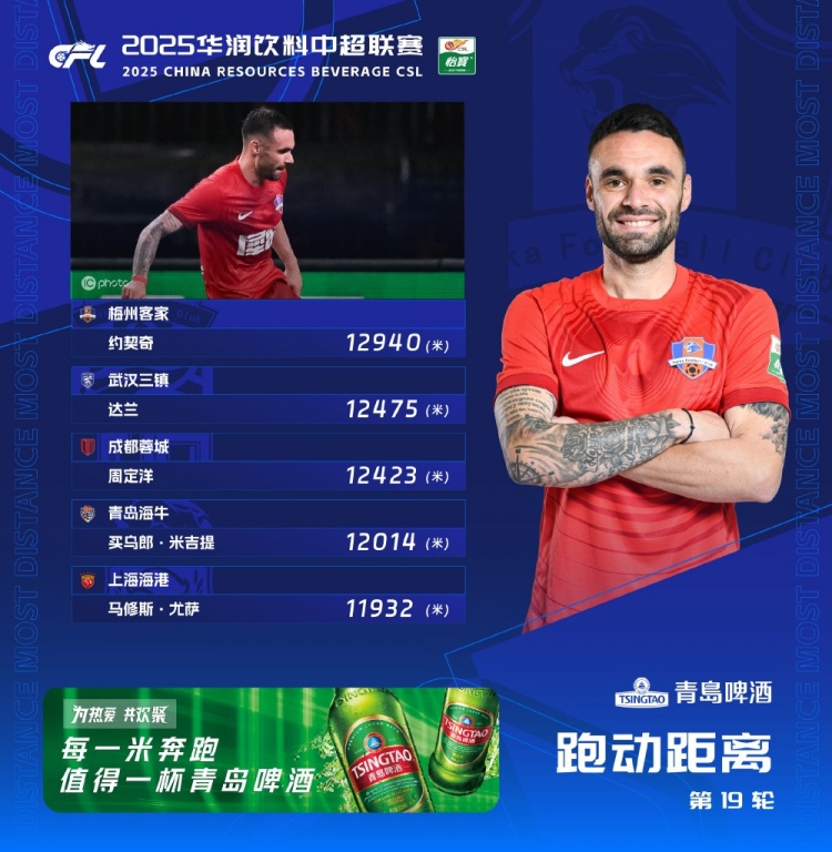 8月4日讯 中超联赛第19轮结束后,官方公布了本轮的跑动距离榜。排在本轮跑动榜榜首的是梅州客家外援约契奇,他的跑动距离达到12940米,这也是他连续两轮在跑动榜登顶榜首。