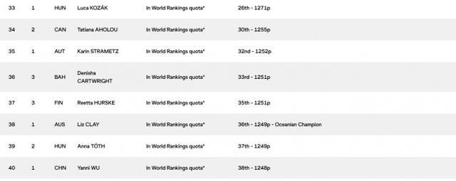直播吧08月22日讯 世界田联公布最新一期世锦赛资格名单,吴艳妮排名第40位,正好卡在资格线上。